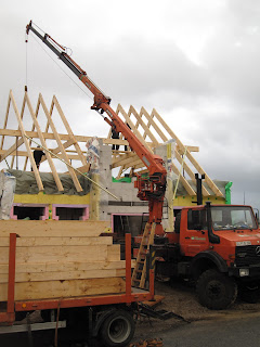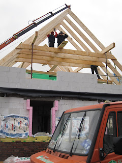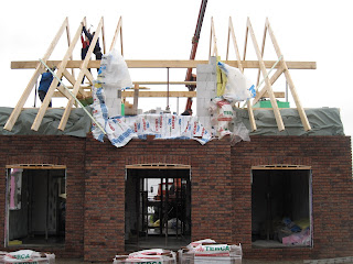 ...und zwar schon vor einer Woche!! Es ging super voran, aber an einem Tag war nicht alles zu schaffen...der Giebel vorn fehlt und der Dachüberstand zur Westseite. Leider hat uns seit letztem Dienstag das Wetter einen Strich durch die Rechnung gemacht...das Dach konnte aufgrund des Sturms nicht fertig gerichtet werden...total blöd:-( vorallem, als wir Freitag erfuhren, dass bis dahin eigentlich sogar das Dach schon gedeckt und fertig geklinkert sein sollte...da hängen wir nun also leider etwas hinterher...danke Petrus:-(