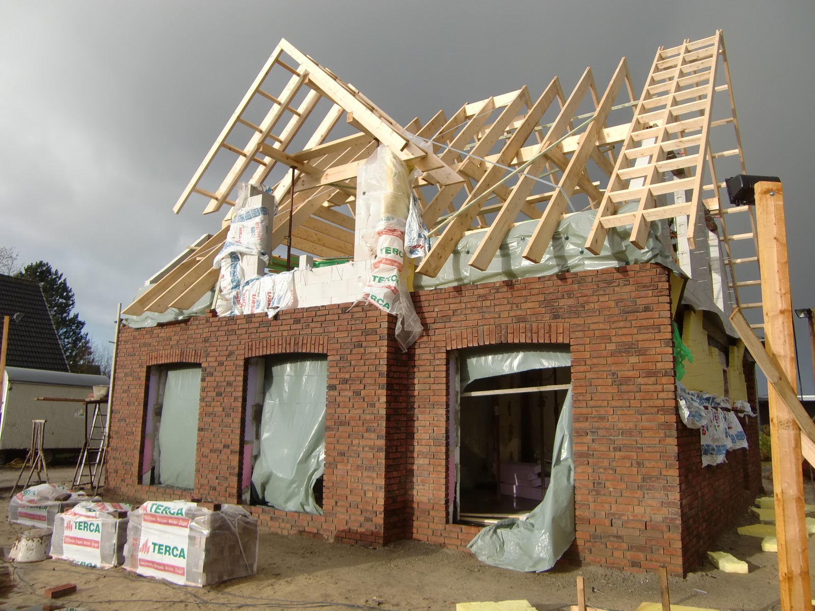 Die Zimmermänner waren trotz des sooo nassen Wetters fleißig und haben es tatsächlich geschafft, das Dach mit Folie zu decken, bevor es in den Weihnachtsurlaub geht!! Vielen Dank!! Damit haben wir bei dem Wetter absolut nicht mehr gerechnet und freuen uns somit doppelt und dreifach darüber:-) So konnten wir ganz entspannt in den Urlaub fahren!!